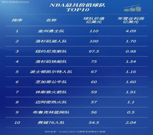 NBA最具價值的1-5名球隊,在商業價值和盈利能力上更是達到了聯盟的頂尖水平,它們分別是金州勇士隊、洛杉磯湖人隊、紐約尼克斯隊、洛杉磯快船隊和波士頓凱爾特人隊。這五支球隊要么擁有深厚的歷史底蘊,要么占據頂級的市場資源,要么具備強大的競技實力,各自在商業運營上都有著獨特的優勢,其中排在榜首的金州勇士隊,更是以110億美元的估值和4.09億美元的年利潤,成為NBA最具價值、最賺錢的球隊,其利潤水平遠超其他球隊。