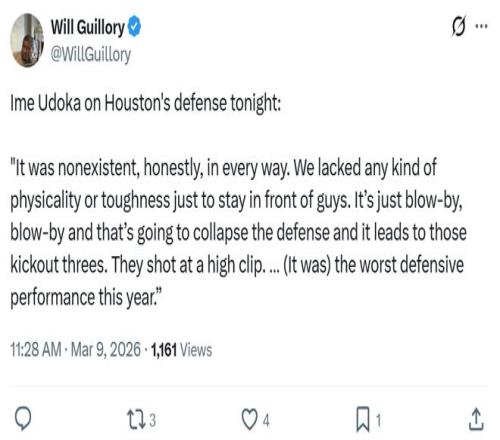全場火箭隊狂丟145分創造本賽季單場失分紀錄,同時臨場變化基本為零,尤其是第三節馬刺隊一波流拉開比分時,烏度卡毫無應對可言。
