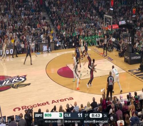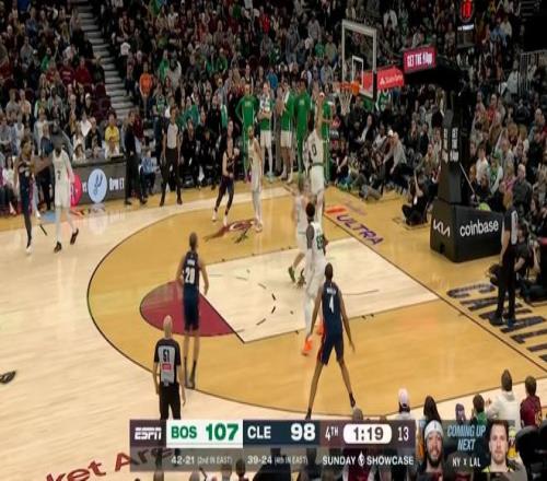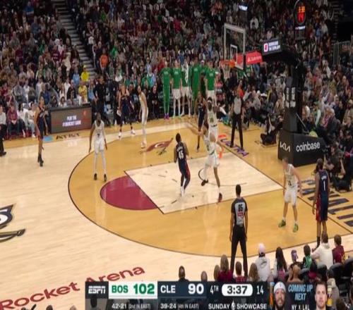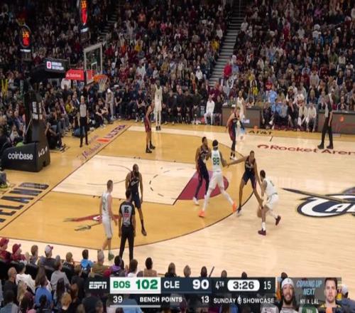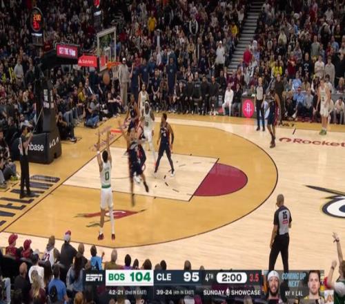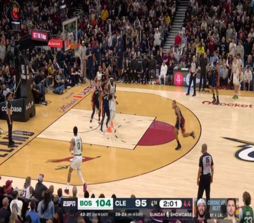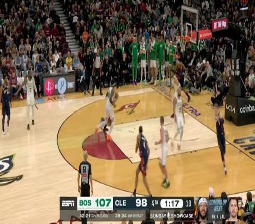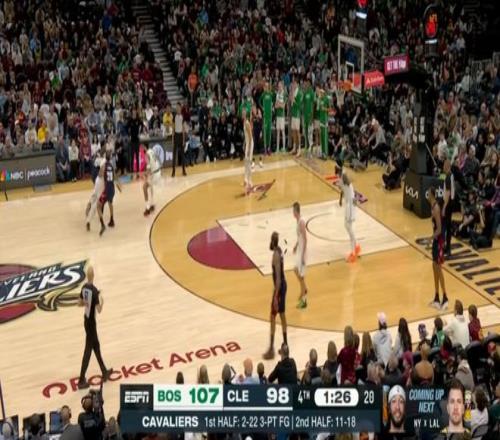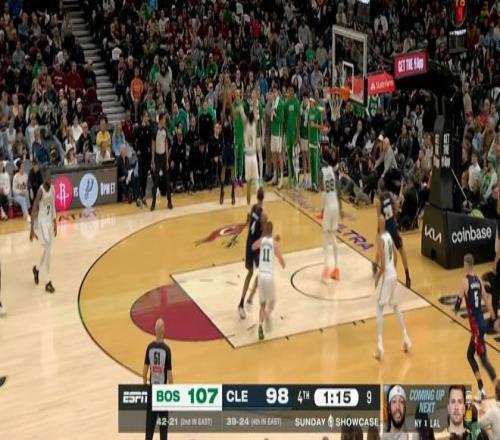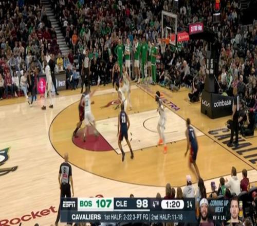 雖說半場就領先了20分,但騎士畢竟是騎士,在米切爾+哈登+莫布利帶領下,第四節一度將分差縮小到個位數,然后還是塔圖姆,連拿5分鎖定勝局: