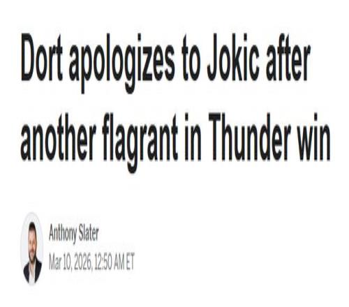 北京時間3月10日,據ESPN報道,雷霆球員多爾特承認,在兩周內第二次在第四節對約基奇送出惡意犯規后,他已經向對方...