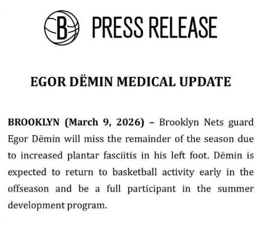 北京時間3月10日,籃網官宣新科8號秀杰明因左腳足底筋膜炎傷勢加重,將缺席本賽季剩余比賽提前賽季報銷,他本賽季...