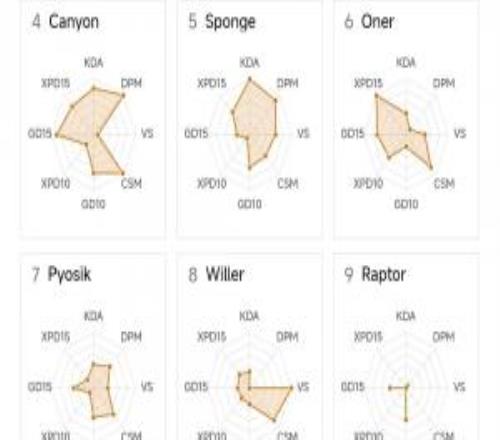 電競體育4月11報道 近日,有國外粉絲制作了4月10日前LCK聯(lián)賽的選手數(shù)據(jù)雷達圖,其中打野位置里數(shù)據(jù)最佳的是BRO的打野GIDEON與KT打野Cuzz,而BFX打野Raptor的雷達圖則成了“時鐘圖”!