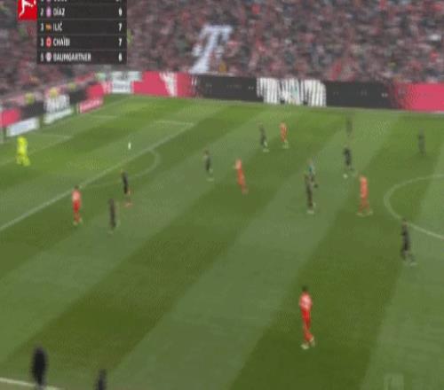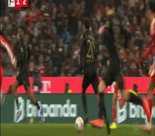 第29分鐘,拜仁前場4打3,迪亞斯把球停大了,隨后被達(dá)門化解