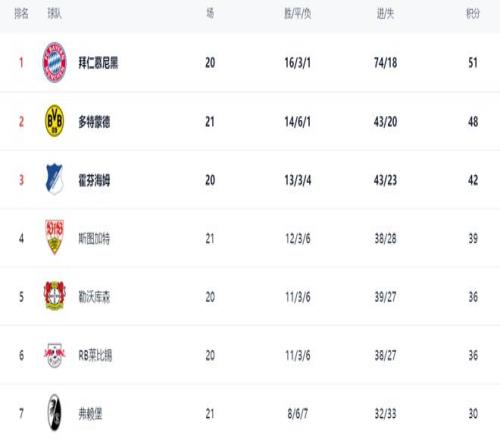 在積分榜上,拜仁依然占據榜首位置,16勝3平1負,拿到51分。而多特蒙德不斷贏球之后,總積分已經達到48分,只落后拜仁3分。不過,多特蒙德比拜仁多踢1場。霍芬海姆以42分排名第3。第4的是斯圖加特,拿到了39分。勒沃庫森以36分排名第5。萊比錫也是36分,排名第6。勒沃庫森和萊比錫與歐冠區的差距都只有3分。弗賴堡拿到30分,排第7。