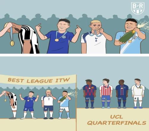 1/8決賽英超與西甲的“3對3”PK,就是歐陸四大聯賽尤其西甲對抗英超的直觀結果。3月18日歐冠1/8決賽次回合第2比賽日開賽前,西班牙職業聯盟主席特巴斯還在新聞會上調侃:“你們今天沒問我英超的問題,是因為昨天兩支英超球隊出局?”而就在特巴斯結束新聞會后,巴薩和馬競又淘汰了兩支英超球隊。西甲三強攜手晉級8強,是西甲第13次在歐冠8強擁有至少3隊,遙遙領先英格蘭(8次)和意大利(4次)。