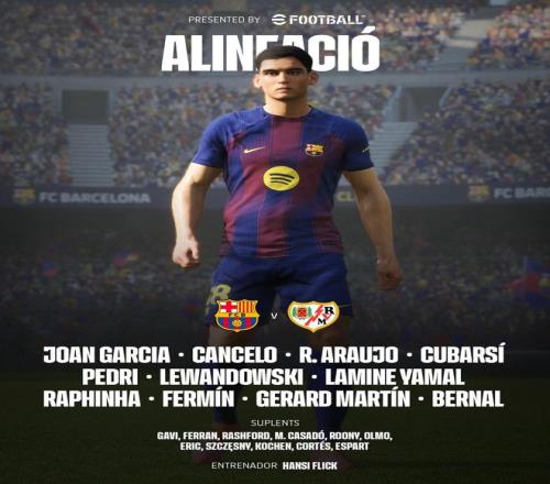 巴塞羅那首發:13-霍安-加西亞、2-坎塞洛、4-阿勞霍、5-庫巴西、18-赫拉德-馬丁、8-佩德里、22-馬克-貝爾納爾、16-費爾明-洛佩斯、10-亞馬爾、11-拉菲尼亞、9-萊萬多夫斯基