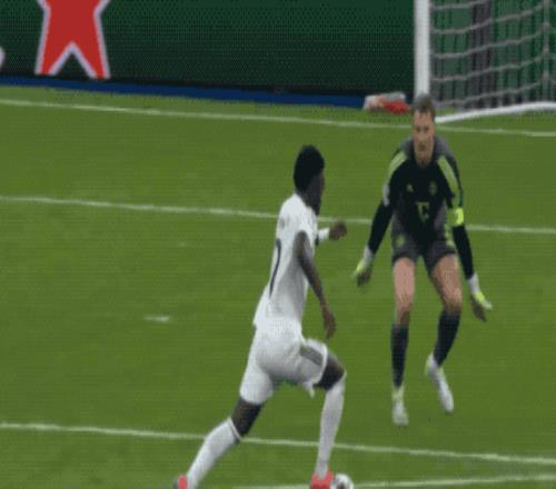 第17分鐘,皇馬終于有了一次像樣的射門,維尼修斯打出反彈球,諾伊爾迅速倒地,完成撲救。