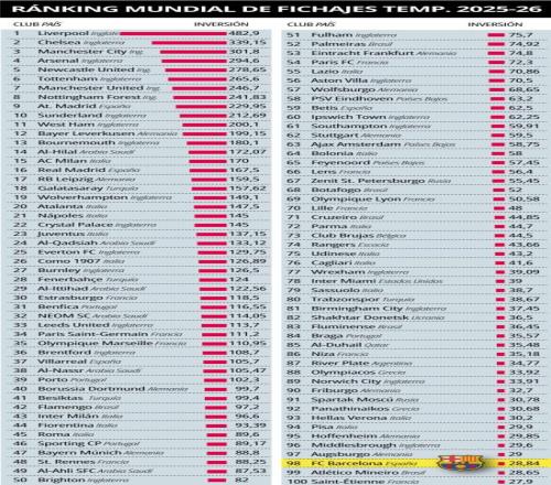 為了說明背景,以下是轉會支出超過巴薩的俱樂部數量分布:英格蘭27家(前11名中占了10家),意大利16家,德國10家,法國9家,沙特阿拉伯6家,巴西5家,西班牙4家(馬競、皇馬、比利亞雷亞爾和貝蒂斯),葡萄牙4家,土耳其4家,荷蘭3家,希臘2家,俄羅斯2家,以及比利時、蘇格蘭、美國、烏克蘭、卡塔爾和阿根廷各1家。