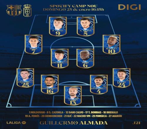 巴薩首發(fā):13-霍安-加西亞、2-坎塞洛、5-庫巴西、18-赫拉德-馬丁、24-埃里克-加西亞、17-卡薩多、21-德容、10-亞馬爾、20-奧爾莫、11-拉菲尼亞、9-萊萬