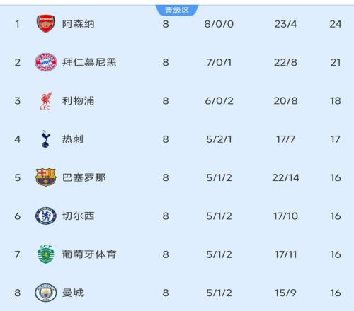 1,隨著本菲卡4-2的獲勝,皇馬的惜敗,本賽季歐冠聯賽,直接晉級的8支球隊包括:英超的阿森納、利物浦、熱刺、切爾西、曼城。多達5支!此外,德甲的拜仁、西甲的巴薩以及葡超的葡萄牙體育也直接晉級。