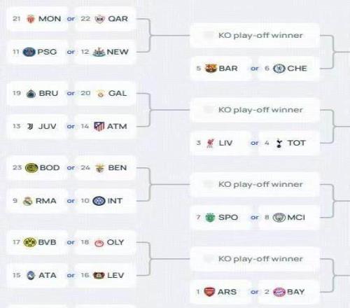 附加賽種子隊(9-16名):皇家馬德里、國際米蘭、巴黎圣日耳曼、紐卡斯爾聯、尤文圖斯、馬德里競技、亞特蘭大、勒沃庫森