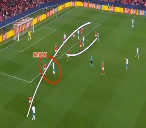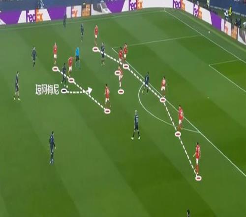 這一次的進攻,最初來自于瓊阿梅尼的遠射,在被封堵之后,皮球轉(zhuǎn)移到側(cè)翼,隨后傳中球打禁區(qū)后點。