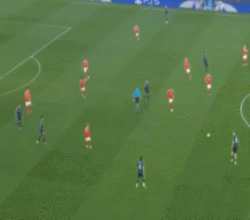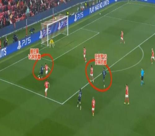 這一波的防守,最初就是邊鋒普雷斯蒂安尼退防到邊后衛(wèi)身側(cè)限制拿球的卡雷拉斯。皇馬這邊回傳后,本菲卡又讓后腰巴列羅卡在肋部,讓皇馬很難對禁區(qū)內(nèi)發(fā)起進攻。