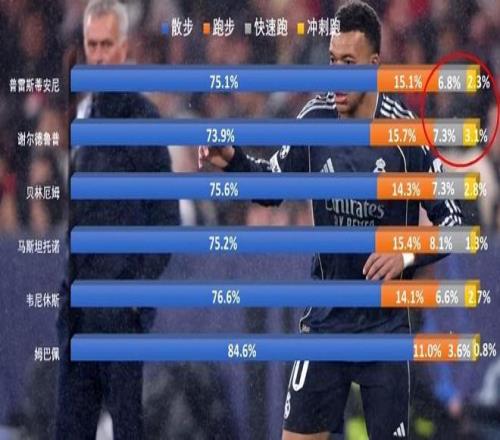 普雷斯蒂安尼雖然沖刺跑比例2.3%不算特別高,不過算上快速跑后,這兩項數(shù)據(jù)綜合也要接近10%,達到了高水準。相比之下,姆巴佩沖刺跑僅有0.8%,加上快速跑之后也僅有4.4%。