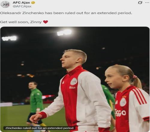 曾官方:阿賈克斯宣布津琴科上場比賽膝蓋受傷,經診斷需要接受手術,并且本賽季無法再出戰比賽(he will not play again this season)。