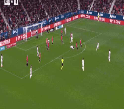 第55分鐘,皇馬大兵壓境,居萊爾本打算和姆巴佩配合,皮球被攔截,居萊爾索性自己射門,皮球擦著橫梁稍稍高出。