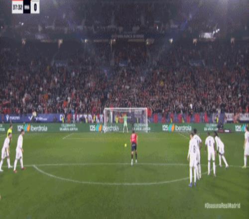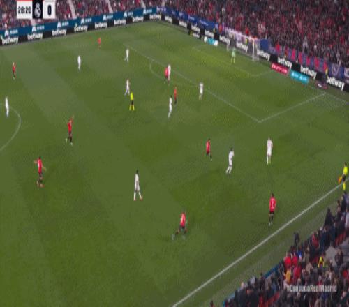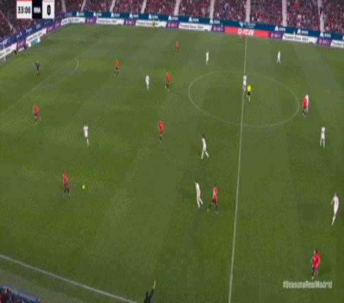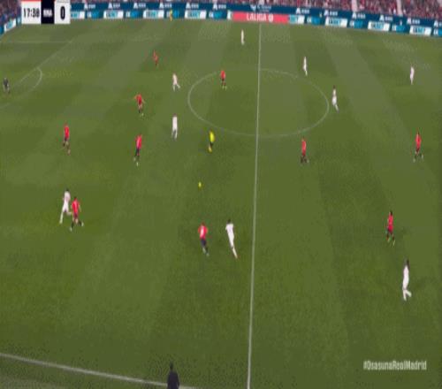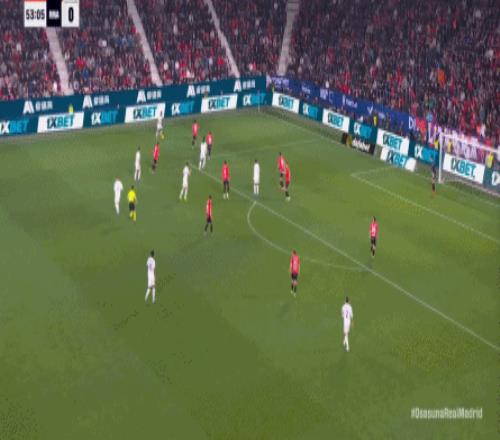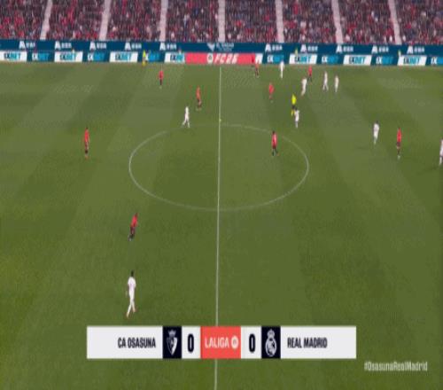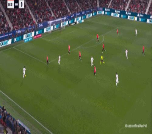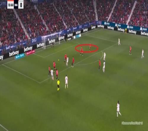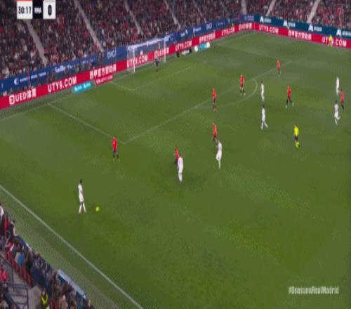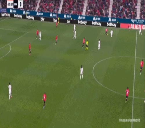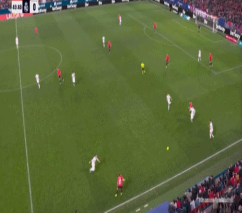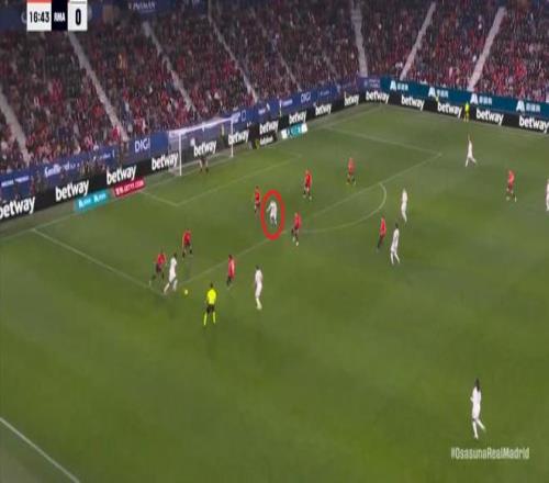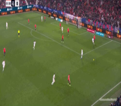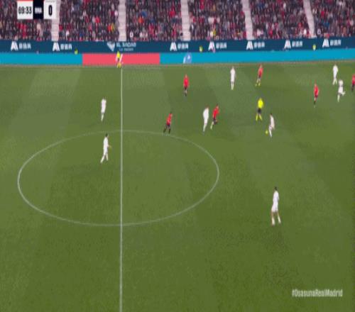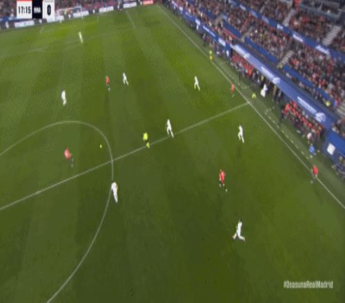 其中一次就是上半場的開分球,在皇馬的進攻和逼搶都極其低效的情況下,奧薩蘇納很容易地就能獲得起腳空間,就像這次,在邊路的處理壓力都不大,于是一腳斜長傳打到結(jié)合部,讓皇馬付出了點球的代價: