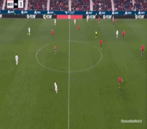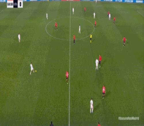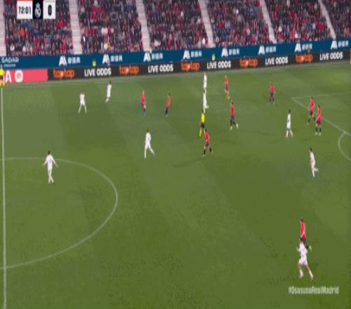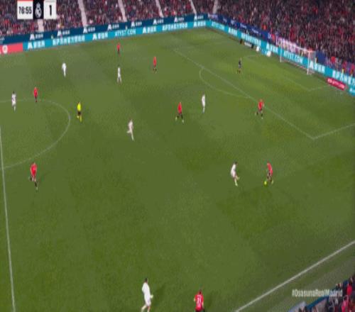 第78分鐘,皇馬在高位人盯人的時候出現(xiàn)問題,讓奧薩蘇納打到了前場,而且再次打出了傳中進攻的威脅: