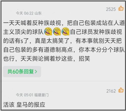 要知道就在不久前的歐冠附加賽上,現場出現了歧視黑人球員的事件,皇馬俱樂部立馬發布反歧視聲明——敢情別人歧視他們球員不行,他們球員歧視中國人就可以?