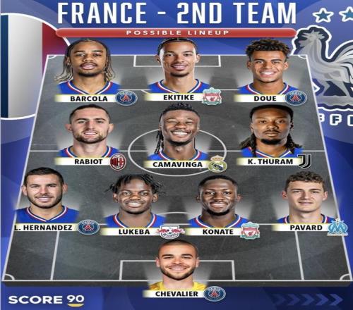最近Score90整理了法國“一隊”和“二隊”的兩套可能首發,把陣容厚度直接擺在臺面上:一隊前場是登貝萊、姆巴...