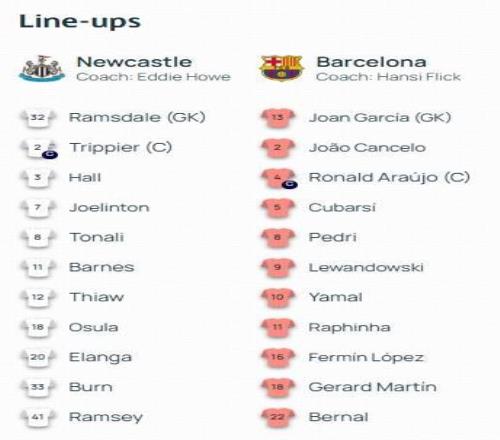 巴薩首發:13-霍安-加西亞、18-赫拉德-馬丁、5-庫巴西、4-阿勞霍、2-坎塞洛、22-馬克-貝爾納爾、8-佩德里、11-拉菲尼亞、16-費爾明-洛佩斯、10-亞馬爾、9-萊萬多夫斯基