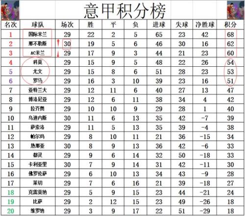 積分榜方面,國米繼續穩穩領跑,那不勒斯連續4輪一球小勝奪4連勝,先賽的他們暫時超過AC米蘭2分升至第2。爭四很激烈,黑馬科莫1分優勢力壓尤文守住第4,羅馬3分之差排在第6。