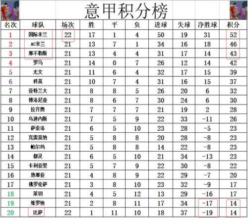 積分榜方面,國(guó)米逆轉(zhuǎn)大勝比薩之后,先賽的他們領(lǐng)先第2的AC米蘭6分,多第3的那不勒斯9分,繼續(xù)坐穩(wěn)榜首位置。比薩遭逆轉(zhuǎn)慘敗后,凈勝球劣勢(shì),換掉維羅納,成了新的副班長(zhǎng)。