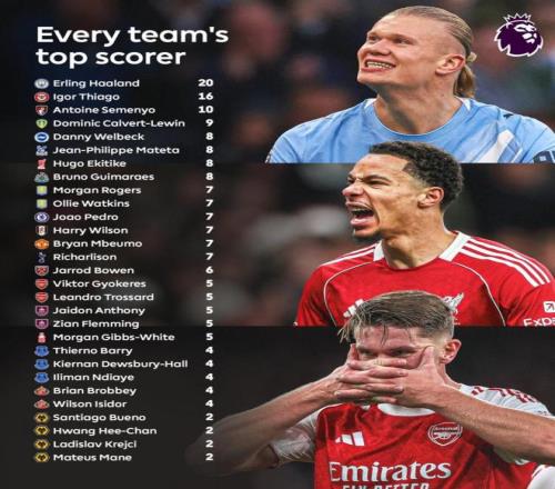 英超聯賽官方統計并公布了本賽季至今(截至當前賽季階段)各支球隊在聯賽中的頭號射手。曼城的埃爾林·哈蘭德以20球遙遙領先,高居榜首。其他表現出色的球員包括布倫特福德的伊戈爾·蒂亞戈(16球)和伯恩茅斯的塞梅尼奧(10球)。