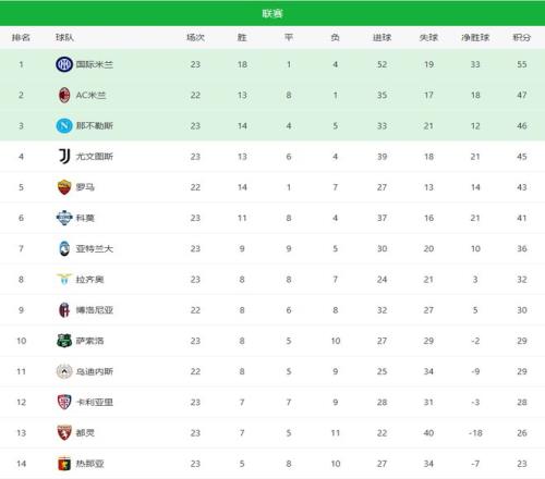 國際米蘭55分穩(wěn)居榜首,領(lǐng)先優(yōu)勢擴(kuò)大到8分;尤文45分位列第一集團(tuán);那不勒斯排名第3,但已落后國米9分,追趕難度不小。