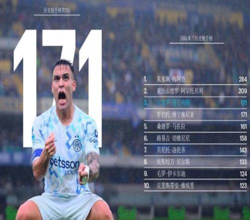 國(guó)米隊(duì)長(zhǎng)勞塔羅此役再度有進(jìn)球入賬,這是阿根廷前鋒本賽季各項(xiàng)賽事第18球,意甲賽場(chǎng)上第14球,目前繼續(xù)領(lǐng)跑射手榜。更重要的是,這粒進(jìn)球是勞塔羅國(guó)米生涯第171球,他正式追平傳奇射手博寧塞尼亞,并列隊(duì)史射手榜第三位,排在他身前的只剩梅阿查(284球)和阿爾托貝利(209球)。