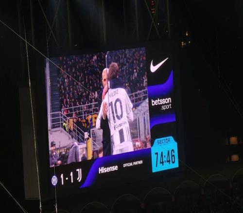 國米擁有中資背景,現在的贊助商中還包括海信和比亞迪等中國企業。在梅阿查球場,大屏幕上不時會打出“BYD”、“Hisense"的標志,海信的logo也不時會出現在球場邊上的兩排廣告燈帶上。國米球迷對中國人友好并不是無緣由的。