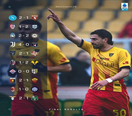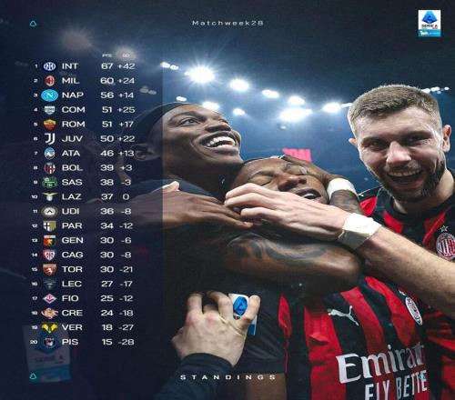 隨著本輪最后一場比賽拉齊奧2比1擊敗薩索洛,意甲第28輪比賽全部結束。本輪聯賽的重頭戲自然是“米蘭德比”二番戰,AC米蘭主場1比0小勝國米,完成了本賽季對同城對手的雙殺,但國米仍然在積分榜上領先紅黑軍團7分;那不勒斯2比1取勝都靈,仍位居第三;羅馬客場1比2負于熱那亞,而本賽季“黑馬”科莫2比1力克卡利亞里,與紅狼軍團同積51分,以凈勝球優勢反超競爭對手來到第四名,羅馬跌至第五,尤文仍居第六,距離羅馬1分。
