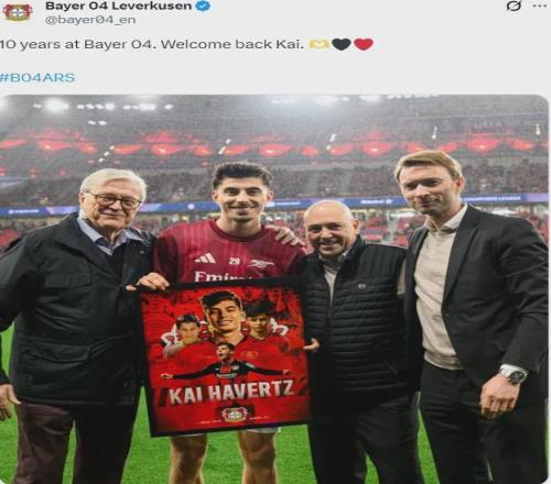 勒沃庫森官推賽前歡迎哈弗茨回家,并且賽前還為哈弗茨送上了紀念品。
