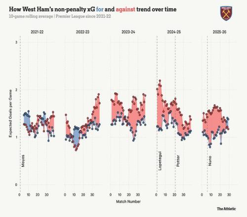 從下方的滾動預(yù)期進球圖可以看出這種防守上的進步。在最近十場比賽中,西漢姆聯(lián)創(chuàng)造出的進球機會(藍線)首次超過了兩賽季以來的自身預(yù)期失球數(shù)。