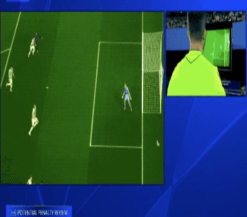 VAR介入,特里皮爾的犯規清晰可見,裁判吹罰點球,并給了特里皮爾一張黃牌。