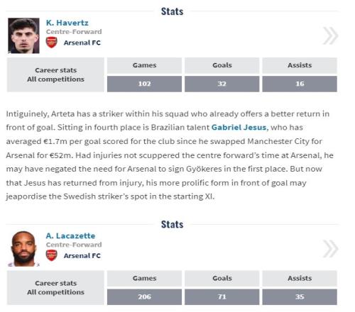 正如上表所示,哲凱賴什目前在阿森納各項賽事中打進了17球。算上他的轉會費,他在北倫敦俱樂部的每個進球平均成本為390萬歐元。