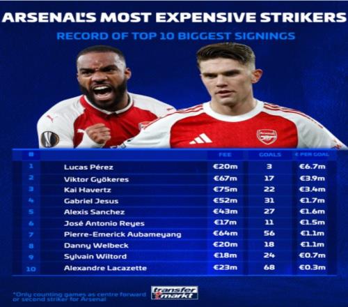 令人擔憂的是,這是阿森納隊史十大最貴前鋒中第二差的表現。只有盧卡斯·佩雷斯(溫格時代那個有些被遺忘的簽約)的情況更糟,他花費2000萬歐元加盟后只打進了3球。