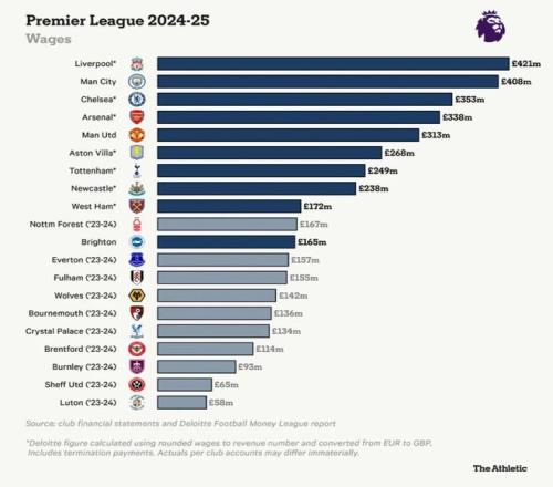 The Athletic:曼聯24/25賽季的工資支出排名英超第5