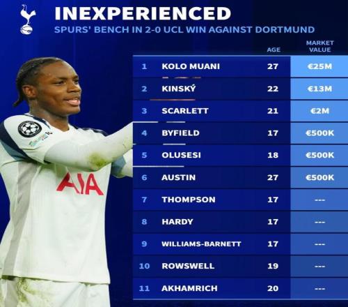 德轉(zhuǎn)的統(tǒng)計同時指出,在歐冠聯(lián)賽階段第7輪熱刺主場2-0擊敗多特蒙德的比賽中,熱刺替補席上的11名球員中有5人甚至在德轉(zhuǎn)上都沒有身價,剩余6人總身價也僅為4150萬歐元。