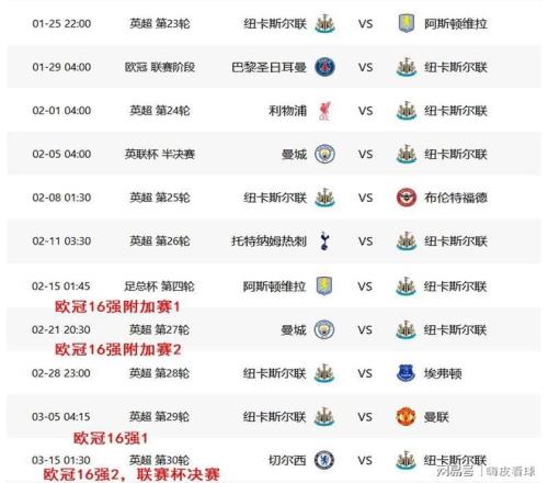 不僅如此,這段賽程當中,還沒有包括可能出現的歐冠16強附加賽的兩回合,以及16強的兩回合。由于紐卡斯爾歐冠末輪跟同積13分的巴黎圣日耳曼碰面,落入附加賽的機會是相當高的。如果全部參加的話,加上聯賽杯半決賽淘汰曼城,上述的賽程中,還要加上4場歐冠和1場聯賽杯決賽,難度將大大增加,實在很難用什么文字來描述。
