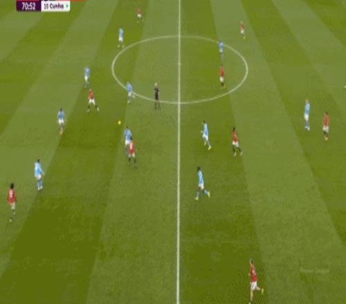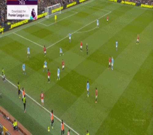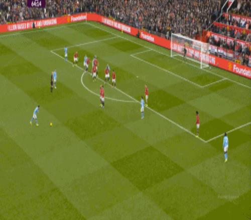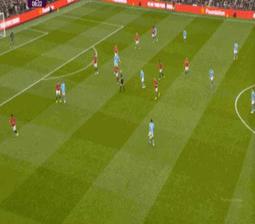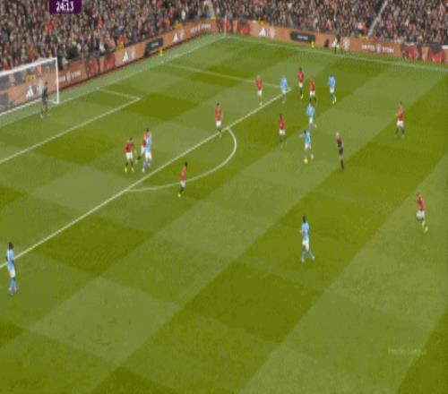 對陣曼城的第一個進球,當然是來自本方半場防下的任意球,但你要注意看到的是,在布魯諾帶球快速向前的路上,多爾古、姆貝烏莫和阿瑪德-迪亞洛全部都在沖刺: