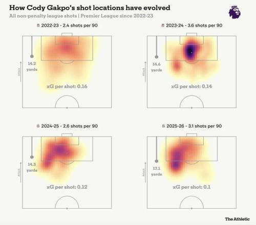 數(shù)據(jù)同樣印證了肉眼所見。加克波下滑的一個(gè)關(guān)鍵原因是射門選擇。下面的射門分布圖顯示,他更多選擇在禁區(qū)左側(cè)邊緣、距離較遠(yuǎn)的位置進(jìn)行冒險(xiǎn)射門,而不是進(jìn)入更具威脅的中路區(qū)域。