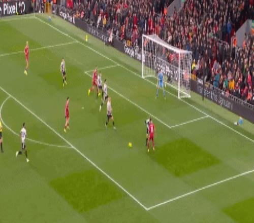 比賽開始后,紐卡斯?fàn)柗炊叩酶又鲃?dòng),前20分鐘連續(xù)制造威脅,紅軍只能來個(gè)防守反擊戰(zhàn)術(shù),等待機(jī)會。第25分鐘,哈維-巴恩斯主罰任意球繞過人墻直奔死角,皮球擊中立柱彈出,安菲爾德驚出一身冷汗。