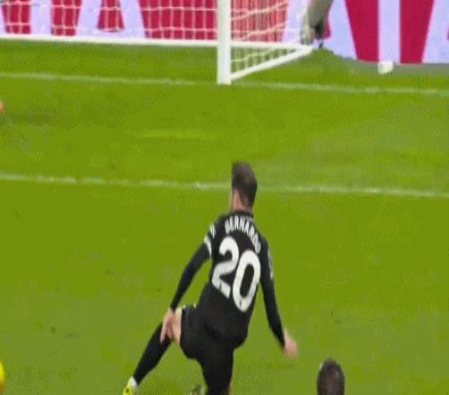 上半場補時階段,德拉古辛后場傳球失誤,羅德里斷球直塞,貝爾納多-席爾瓦禁區內鏟傳,無人盯防的塞梅尼奧輕松推射破門。進球之后,塞梅尼奧空翻慶祝,卻落地不穩倒在了草坪上。