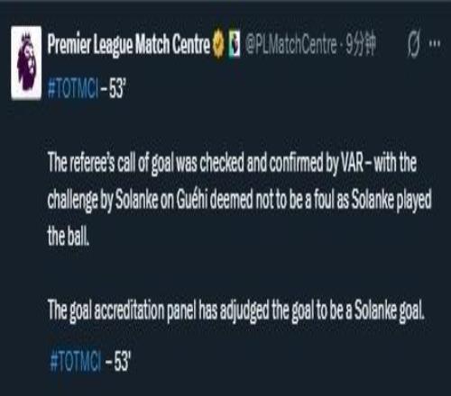 而英超官方也宣布,索蘭克對格伊的接觸不構成犯規,因為前者碰到了球。進球認證小組已經判定該進球是索蘭克的進球。