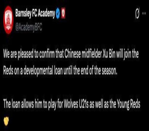 巴恩斯利青訓(xùn)學(xué)院的官方公告是:“我們很高興地確認(rèn),中國(guó)中場(chǎng)球員徐彬?qū)⒆鳛榘l(fā)展性租借球員加盟巴恩斯利,租借期將持續(xù)至本賽季結(jié)束。這筆租借將允許他同時(shí)代表狼隊(duì)U21及巴恩斯利青年隊(duì)出戰(zhàn)。