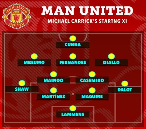本場是臨時主帥邁克爾·卡里克上任后的第四場聯賽,他繼續沿用了回歸球隊傳統的4-2-3-1陣型,取代了前任阿莫林令人不適的3-4-3。這一調整為球隊帶來了清晰的攻防結構。B費被固定在前腰位置,與鋒線的姆伯莫、庫尼亞聯系緊密;年輕的梅努則與卡塞米羅組成雙后腰,負責中場的轉換與保護。數據顯示,曼聯全場控球率高達65%,傳球成功率90%,完全掌控了比賽節奏。