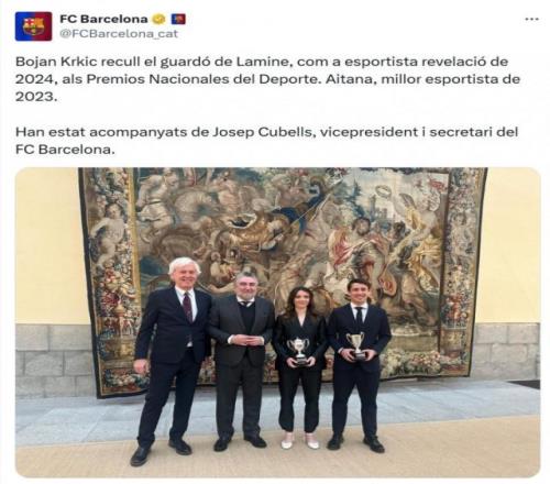 2月11報道 巴薩邊鋒亞馬爾獲得西班牙國家體育獎2024年最佳新人運動員獎,由博揚代為領獎。西班牙國家體育獎頒獎典禮在2026年2月11日進行,表彰2023年、2024年的杰出體育成就。亞馬爾2024年表現出色,幫助西班牙國家隊贏得歐洲杯冠軍,獲得2024年最佳新人運動員獎,亞馬爾沒有出席頒獎典禮,由巴薩足球部門協調員博揚代為領獎。