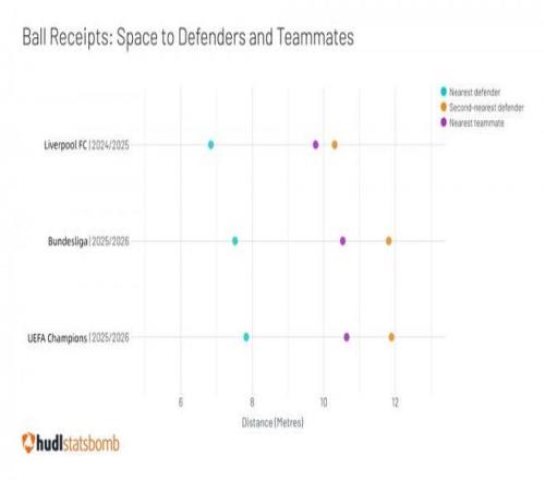 截至英超第23輪,利物浦左路場均突破從迪亞斯離隊前的11.2次降至7.5次,進攻三區(qū)傳球成功率從81%跌至65%,造點僅2次,而迪亞斯本賽季在拜仁造點6次,成為德甲造點王。過往在利物浦迪亞斯并不是絕對核心,也不是絕對主力,單看數據他上賽季甚至不如“神秘內切男”加克波,但失去迪亞斯的沖擊力導致利物浦的高位壓迫體系場均前場壓迫次數從18.5次降至15.2次,反擊機會減少35%。