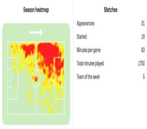 如果現在再回看迪亞斯的參與進球和參與制造得分機會完整點位圖,你會發(fā)現,迪亞斯最有威脅的時間主要集中在下半場前半段和后半段,這兩個足球比賽尤為關鍵的時期。本賽季,拜仁在落后或膠著的比賽中,迪亞斯貢獻7球4助,獨造11球,占球隊膠著局進球數的42%。迪亞斯的所有數據,都是在全德甲所有球員壓力值最大的情況下取得的,即便這樣他也竟然也值是本賽季德甲場均評分第二的左邊鋒,但所有數據都能證明迪亞斯有一顆大心臟。